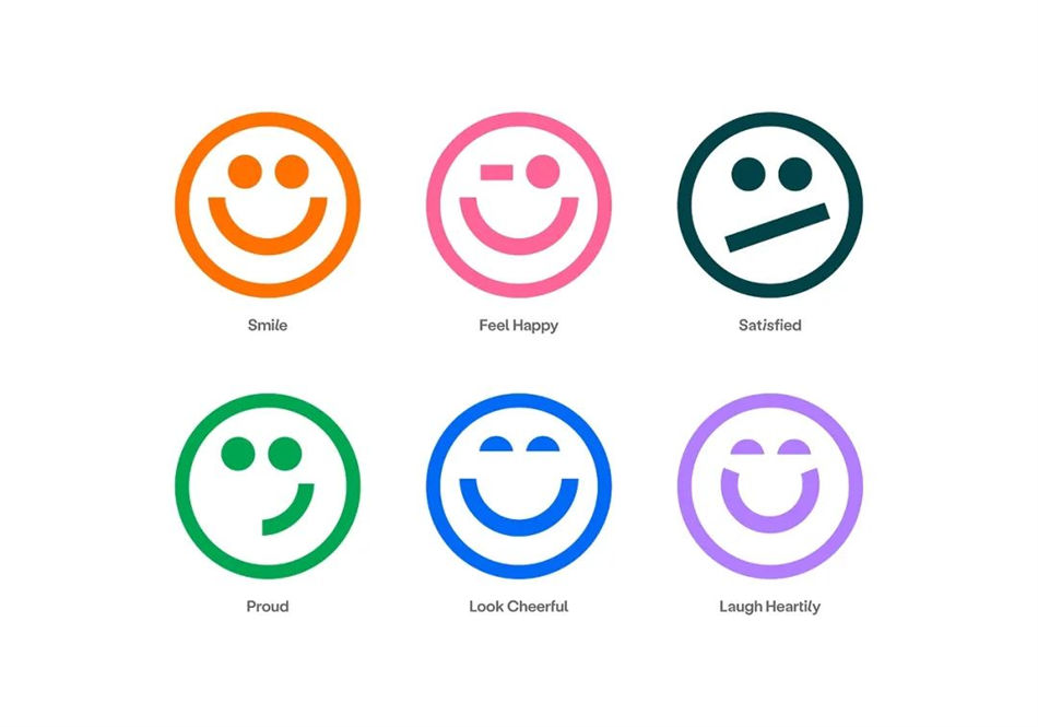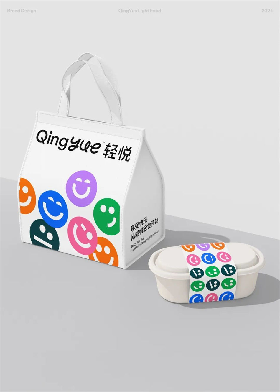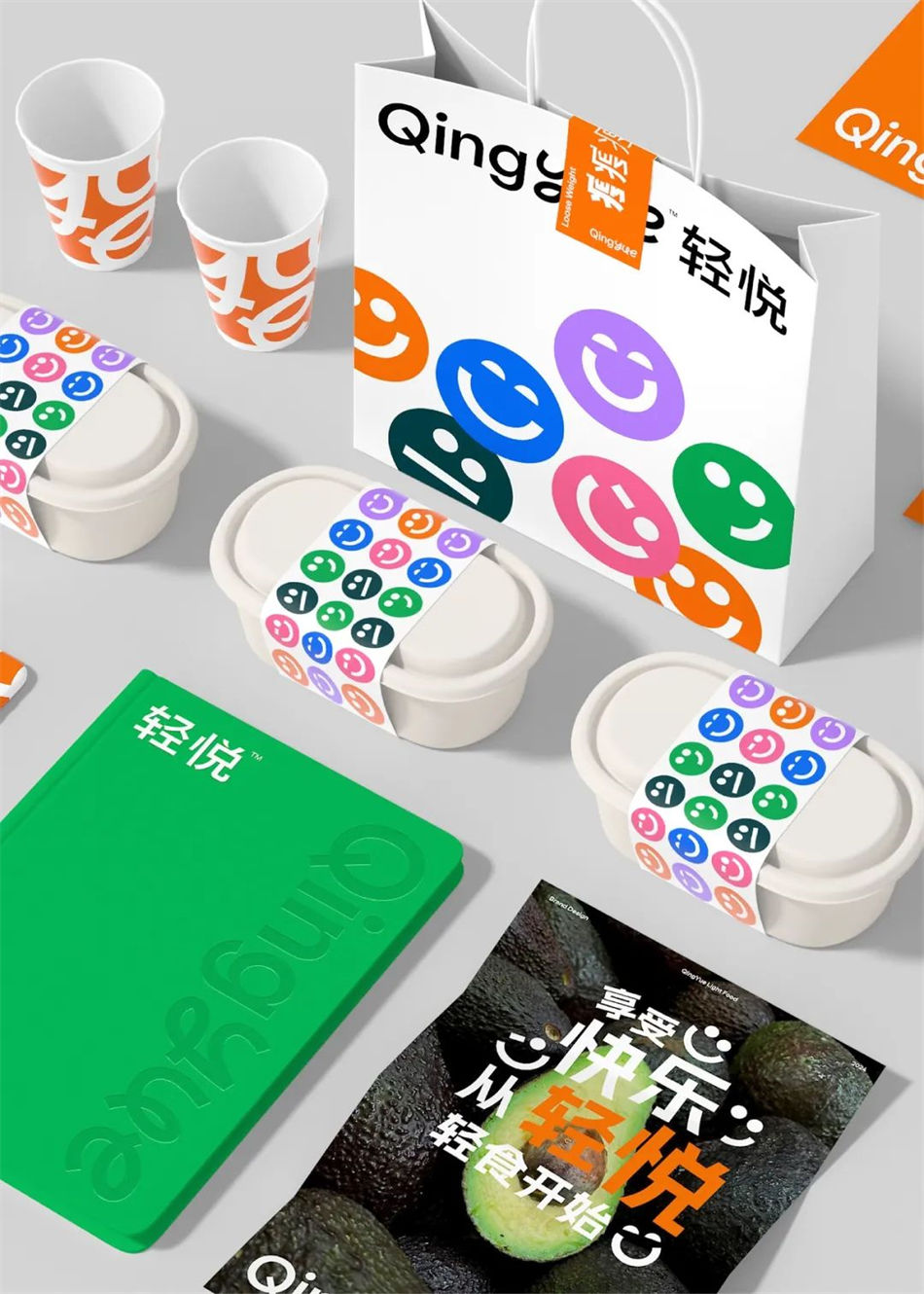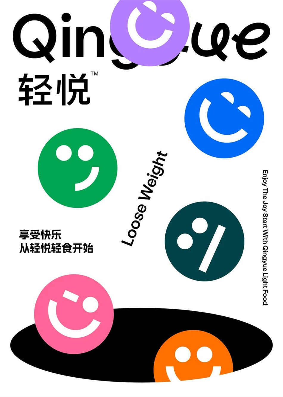 QingYue輕食品牌是一家專注于注重身材管理的年輕一代品牌,該輕食品牌設計以快樂出發,將其轉化為品牌設計元素,并且融入到設計中,讓品牌更具辨識度,與消費者更加親近。以六個不同的笑臉來表達消費者飲食后在不同階段所帶來的心理感受,將笑臉貫穿整個品牌視覺。