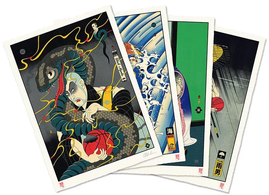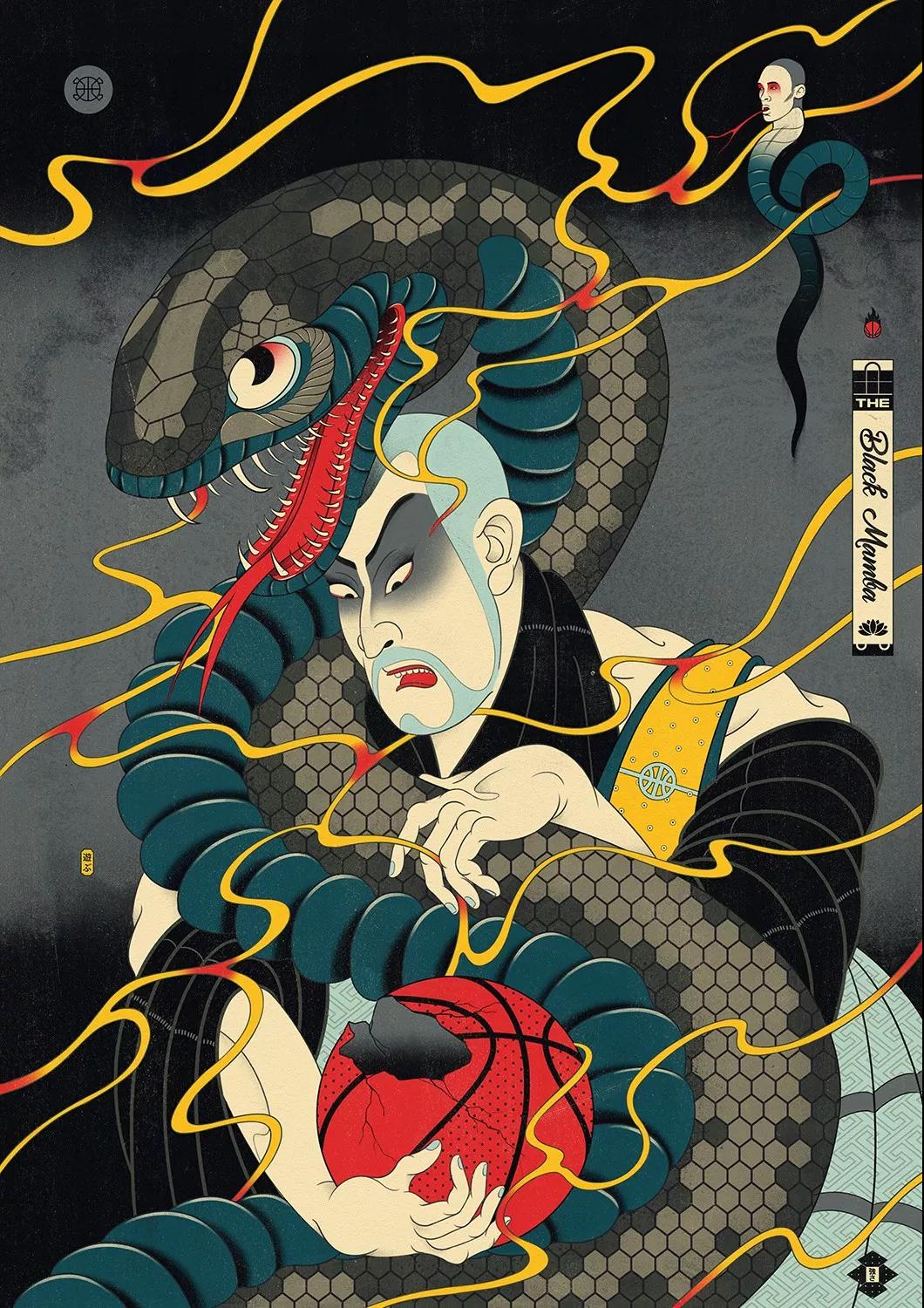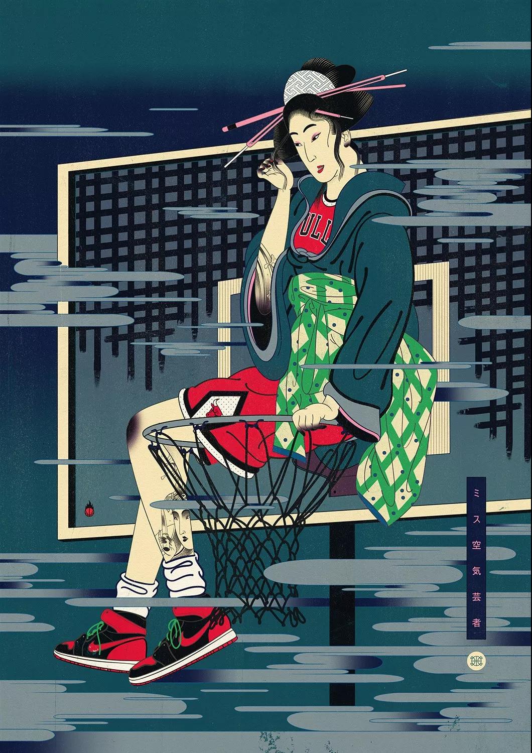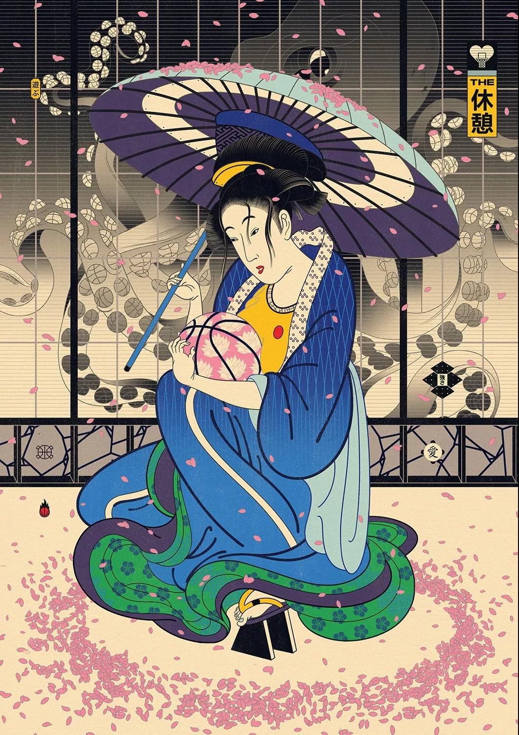 澳大利亞的藝術總監Andrew Archer,出于對日本文化與NBA的喜愛,畫作中,他巧妙地將籃球元素運用在藝妓的傳統和服上,又或者是直接讓他們穿上球衣,就連后頭背景的小細節沒放過,除此之外,Andrew更會將球星以浮世繪方式呈現,包括了Stephen Curry、Klay Thompson、LeBron James、Russell Westbrook,還有剛完成球衣退役儀式的黑曼巴Kobe Bryant。