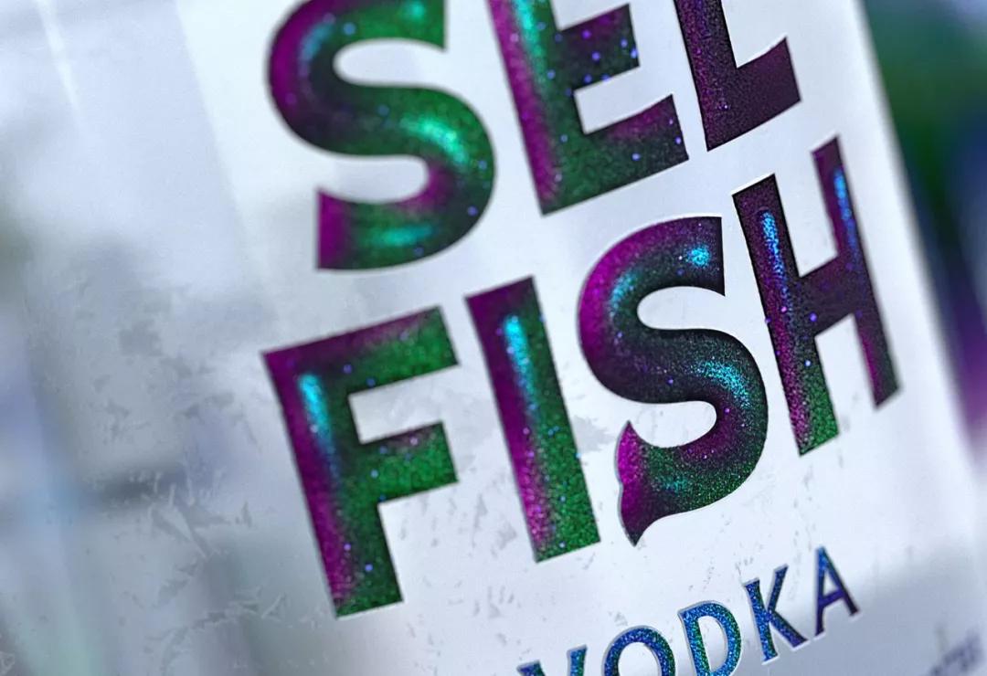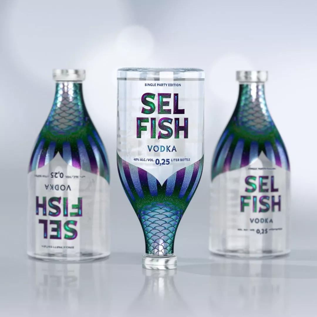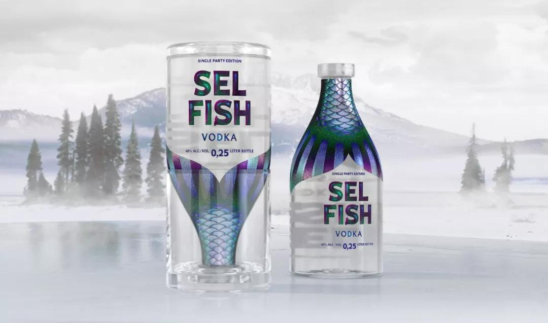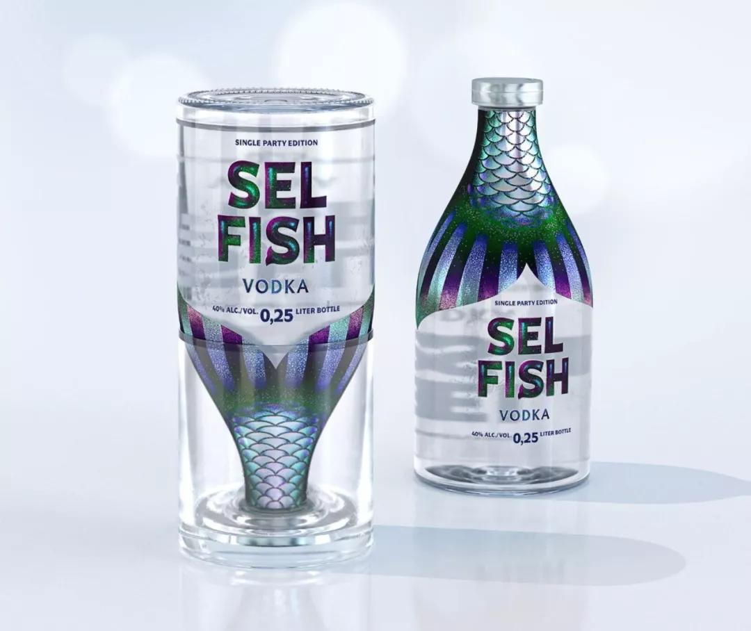SEL FISH這款伏特加瓶身包裝設(shè)計(jì)得很有創(chuàng)意,以魚為靈感,將瓶子與玻璃杯融合在一起,瓶子上半身采用魚尾的圖案元素,使整體好似一條游動(dòng)的魚的概念設(shè)計(jì)。并且這款伏特加只給一人份飲用,所以也與品牌形成雙關(guān)語。