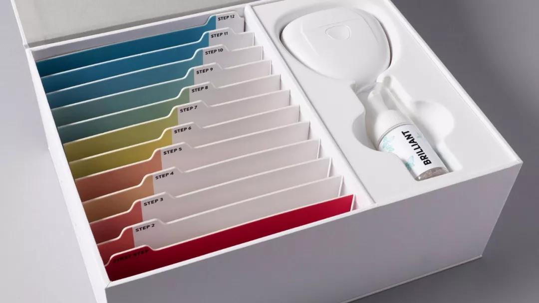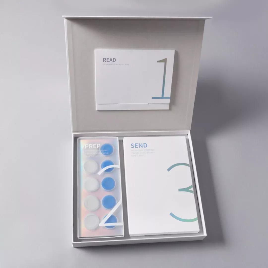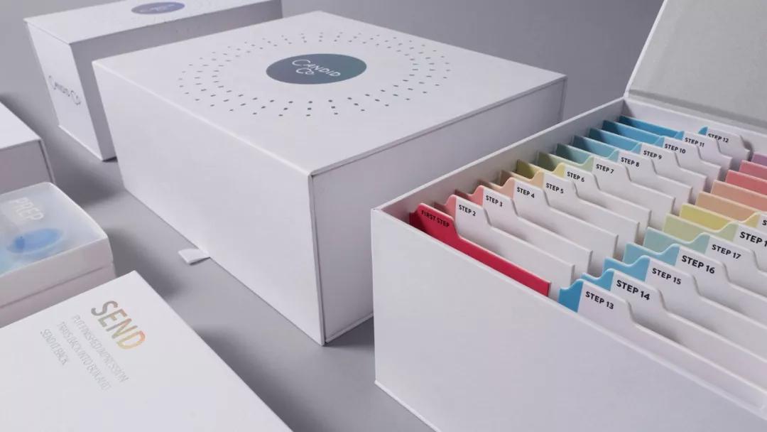 這是一款關(guān)于Candid品牌的牙齒糾正器包裝設(shè)計,該牙齒糾正器包裝設(shè)計以白色作為主色調(diào),同時搭配各種漸變色彩的標(biāo)識和數(shù)字標(biāo)語,整體簡約明了,高級感滿滿。