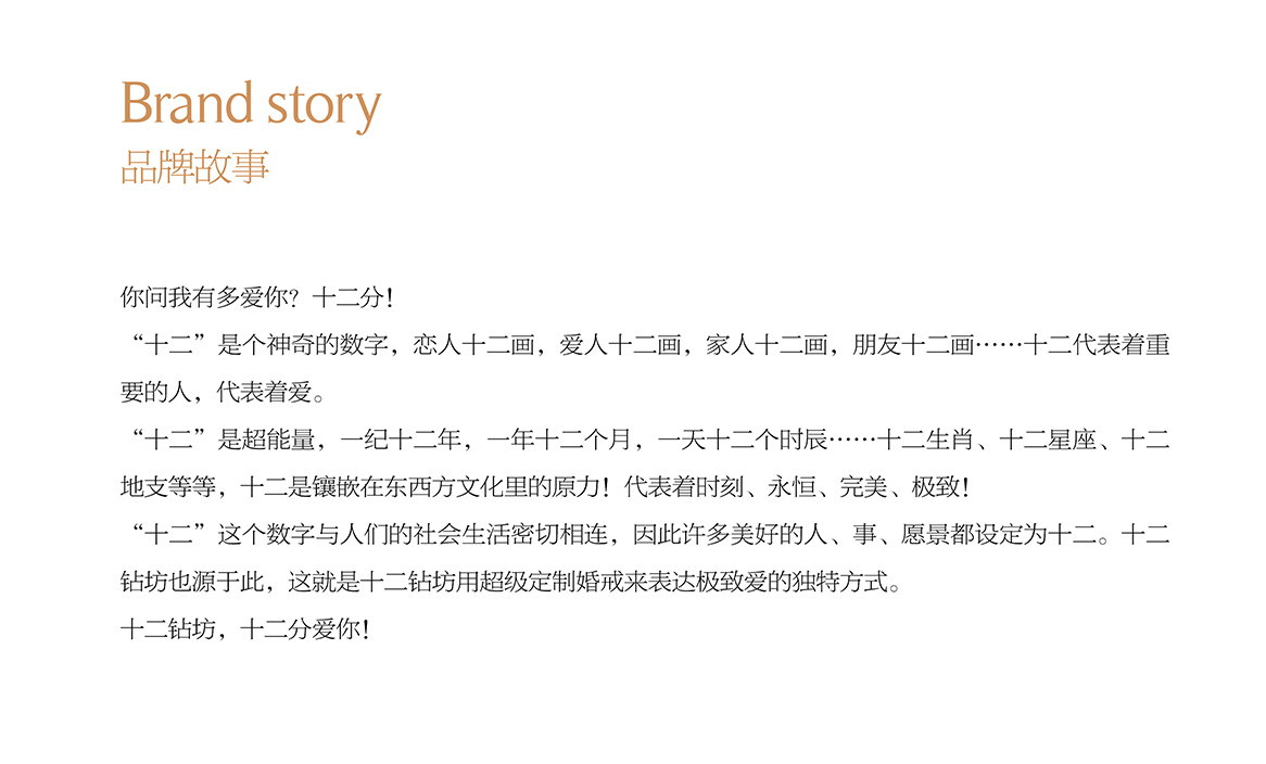 十二鉆坊是一家超級婚戒定制中心,擁有成熟完善的鉆石采購、創意設計、精工鑲嵌、品牌傳播、團隊建設、管理運營產業生態鏈,是珠寶行業首家把鉆戒定制全工藝流程融入店面的體驗式婚戒定制品牌。在這里消費者可以零距離接觸婚戒定制,親身體驗婚戒定制全過程。由相愛的兩個人與設計師一起提煉獨一無二的愛的物語,共同參與婚戒創意設計,并親手打造兩個人專屬的愛情信物,凝固愛情美好時光,銘記美好的愛情,戴在相愛的人的指間,記在相愛的人的心里。在十二鉆坊,婚戒不僅是華麗閃耀的鉆石,更是有故事有溫度有生命的靈魂,是婚戒主人愛的濃縮與升華,是真愛的意義。