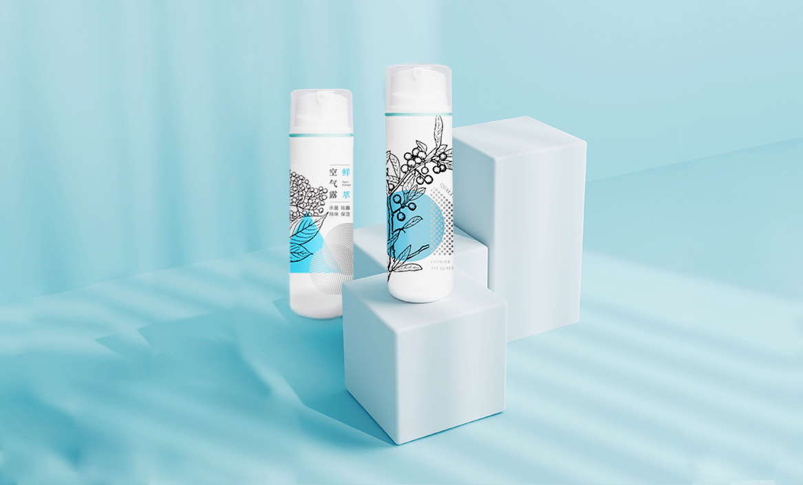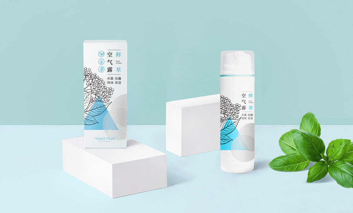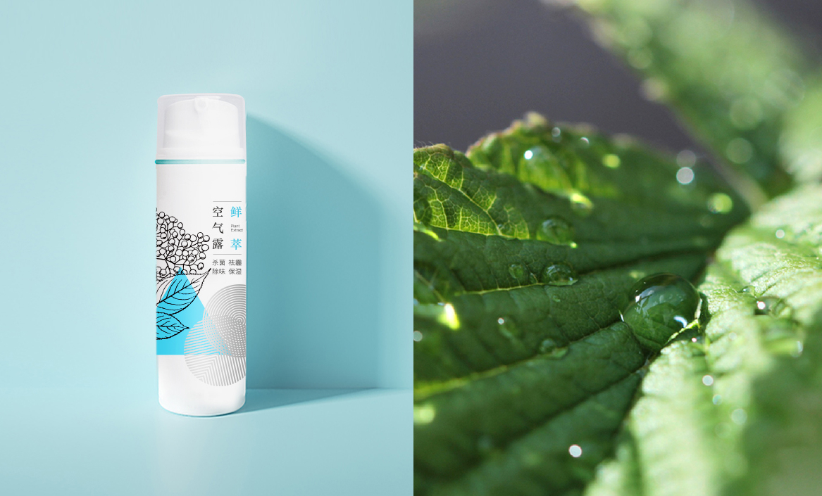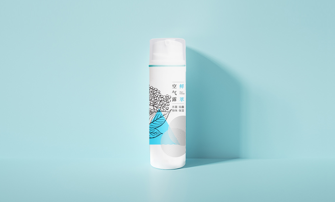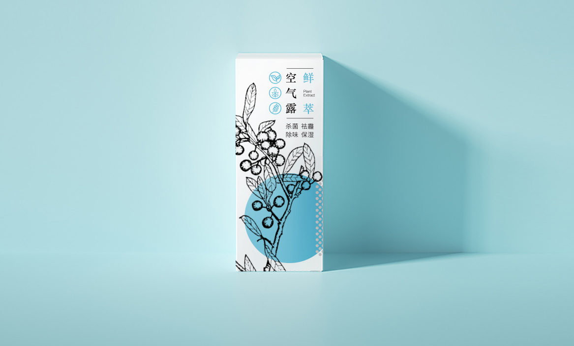 包裝設計定位:簡約、純粹、清新、自然。用產品成分代表植物留蘭香、龍葵花葉白描手繪特寫表達產品的自然屬性,幾何形狀的淺藍色代表湛藍潔凈的天空,點狀代表空氣和陽光,圓環代表光暈和水暈。