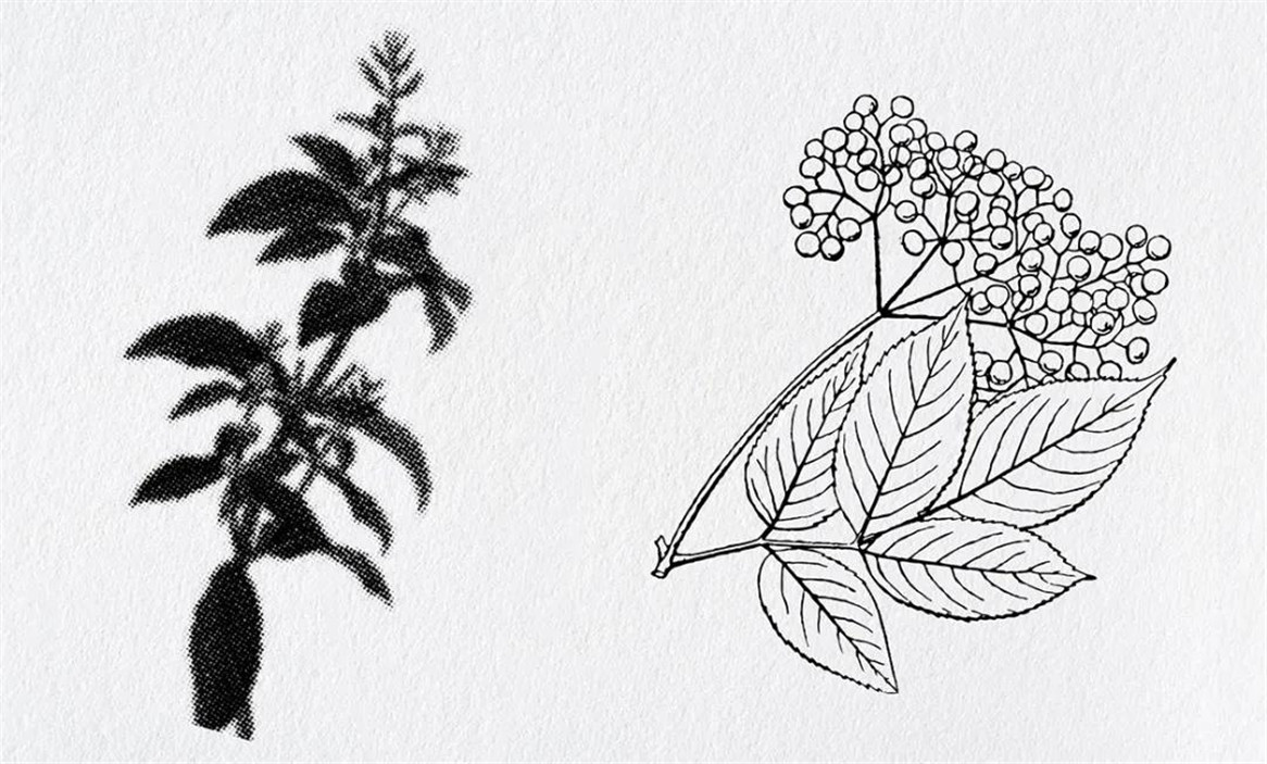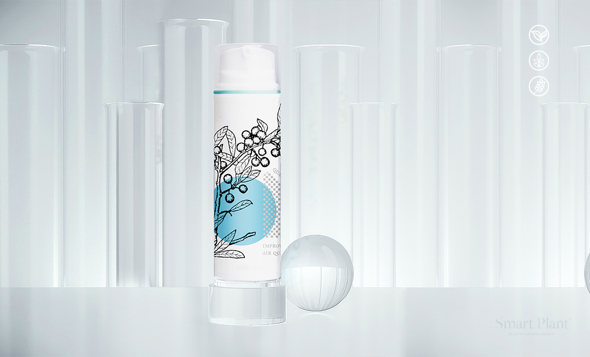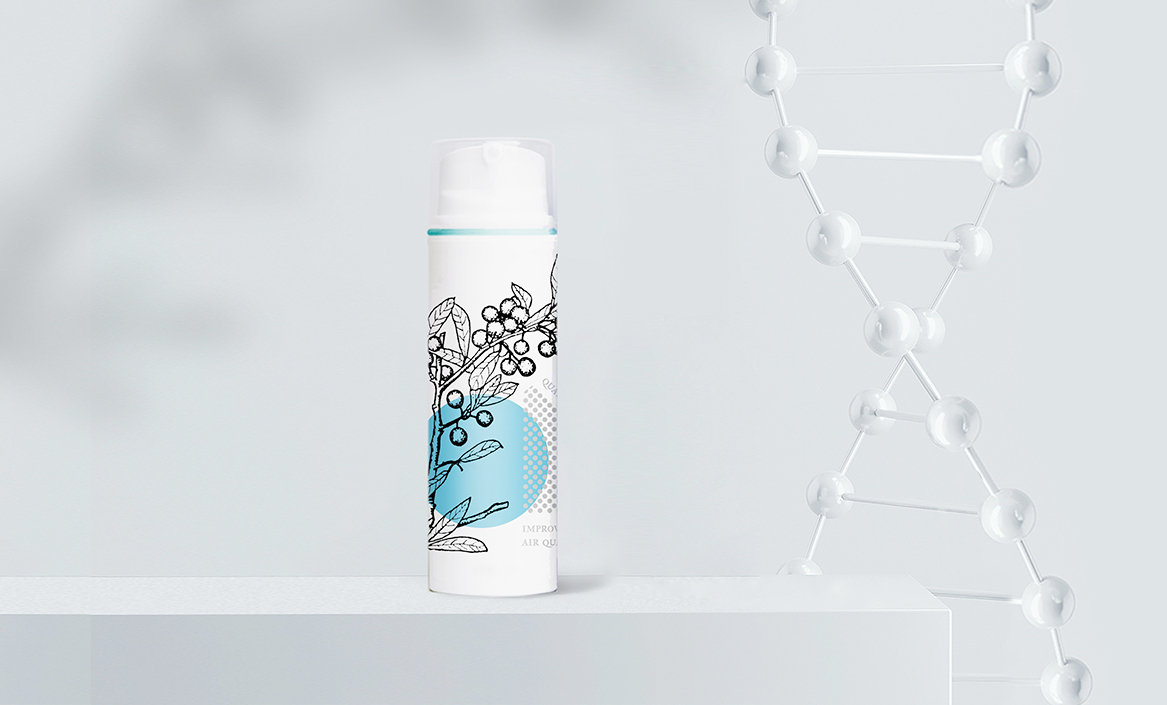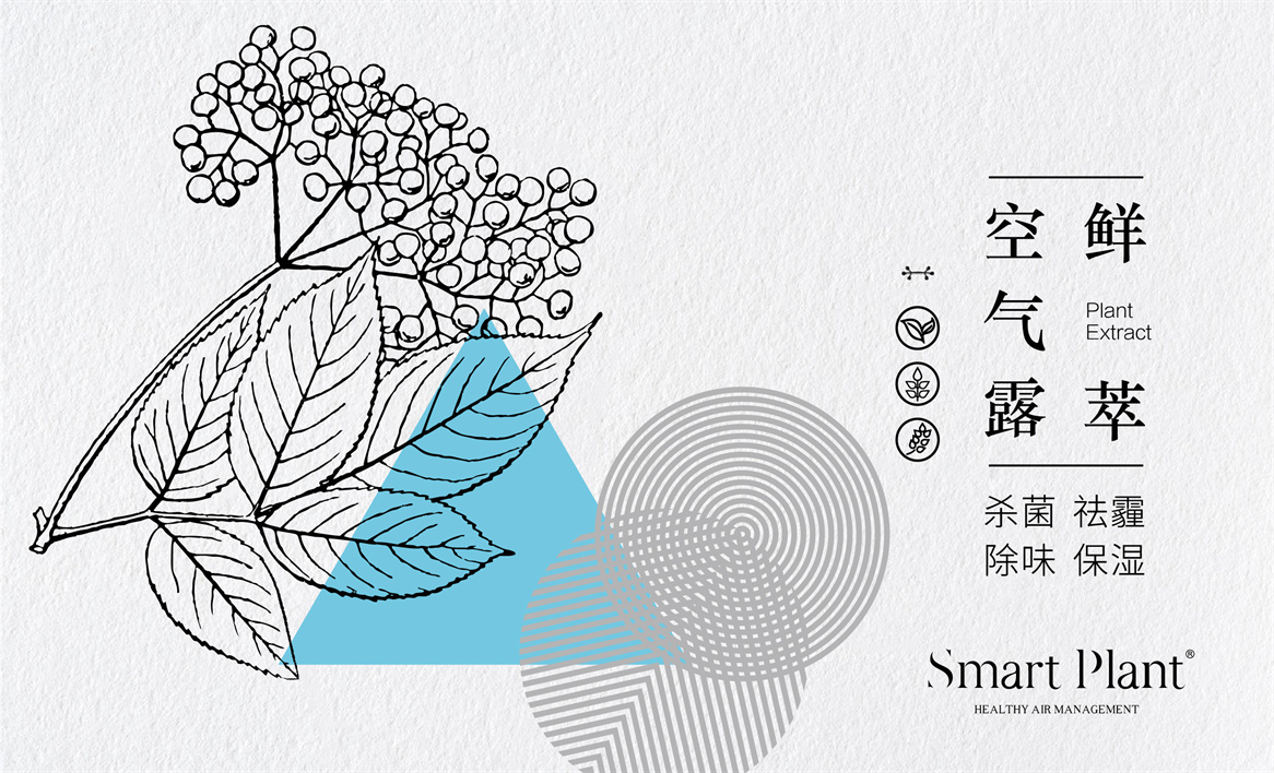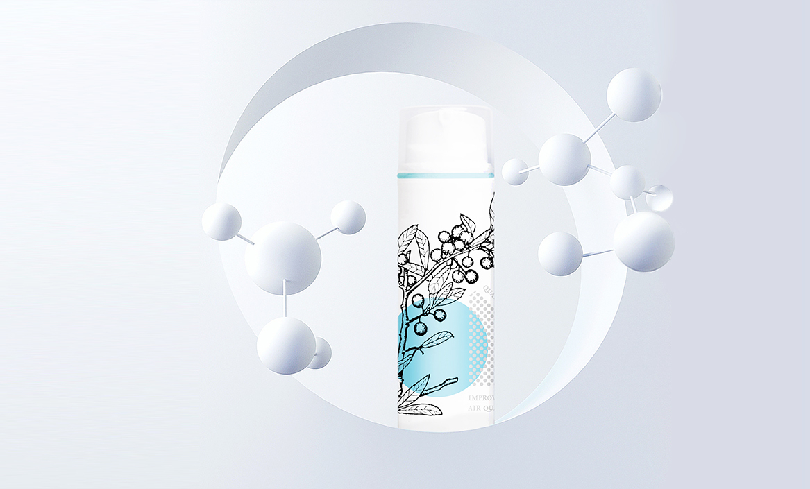 包裝設計定位:簡約、純粹、清新、自然。用產品成分代表植物留蘭香、龍葵花葉白描手繪特寫表達產品的自然屬性,幾何形狀的淺藍色代表湛藍潔凈的天空,點狀代表空氣和陽光,圓環代表光暈和水暈。