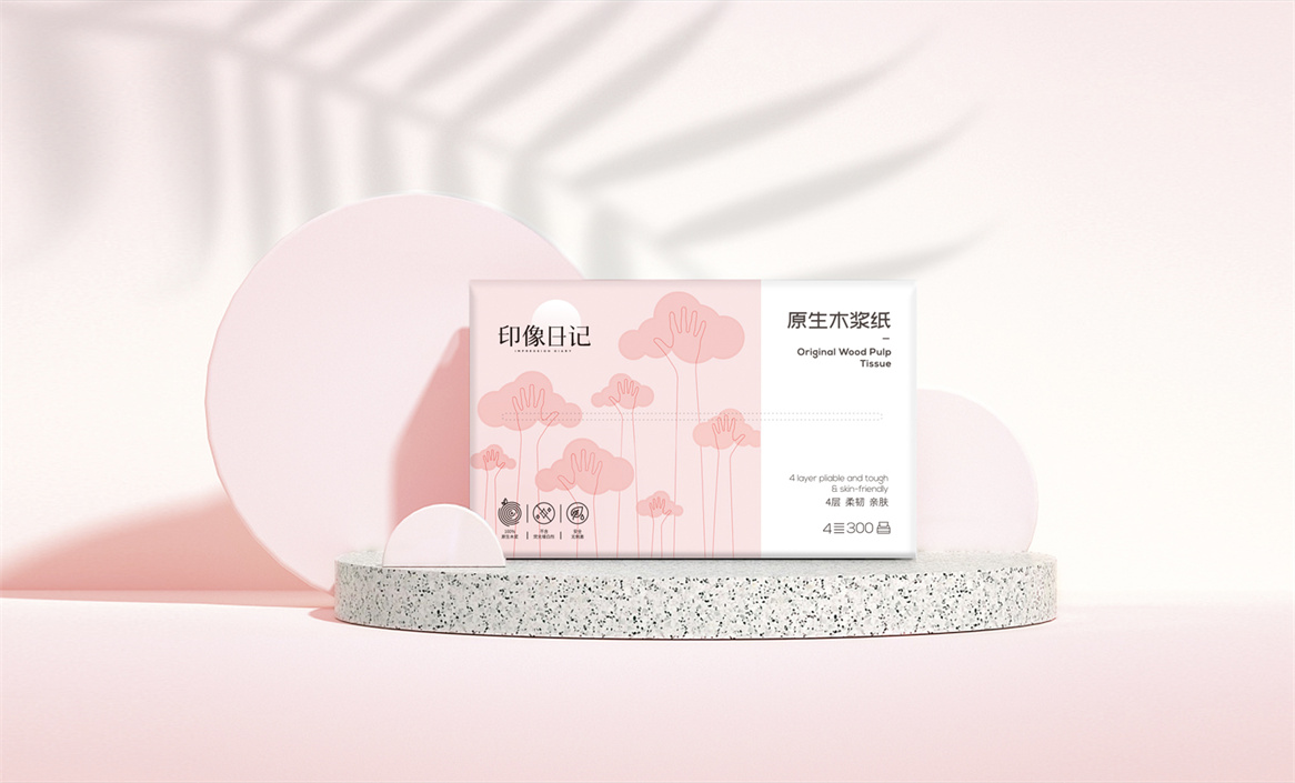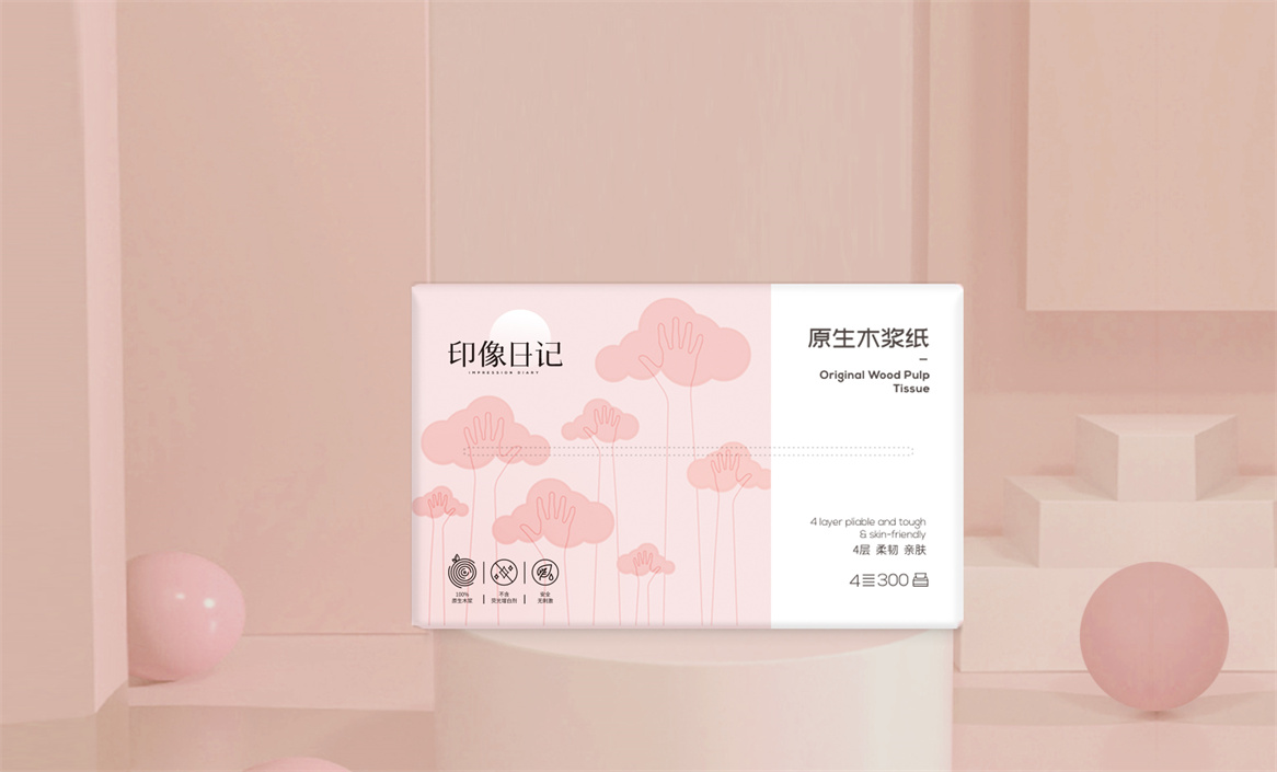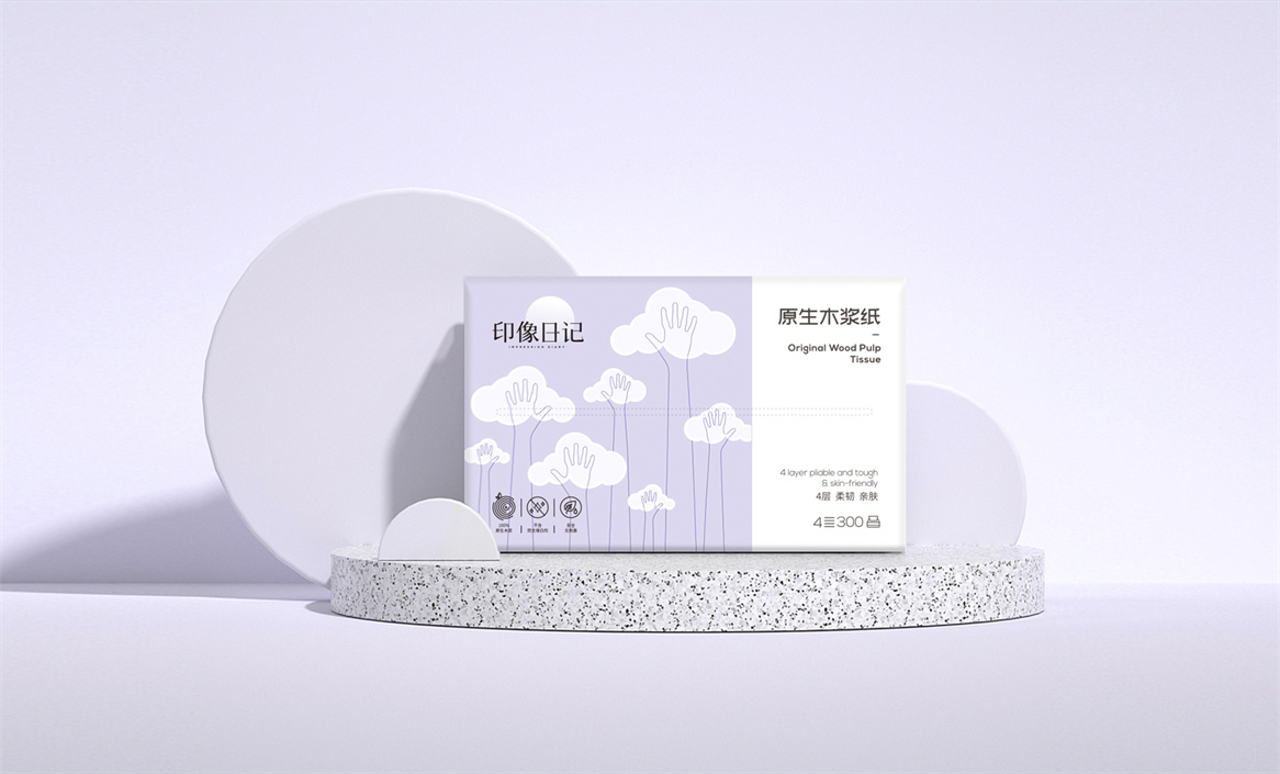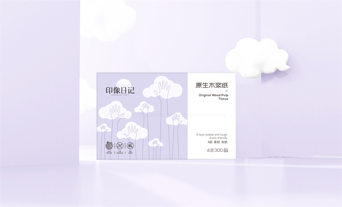 印象日記原生木漿紙包裝設計以“自然手護”為創作理念,用柔和的云朵與手構成大樹森林,風格自然、柔和、舒適,表達印象日記“原生、柔韌、親膚”的產品訴求。