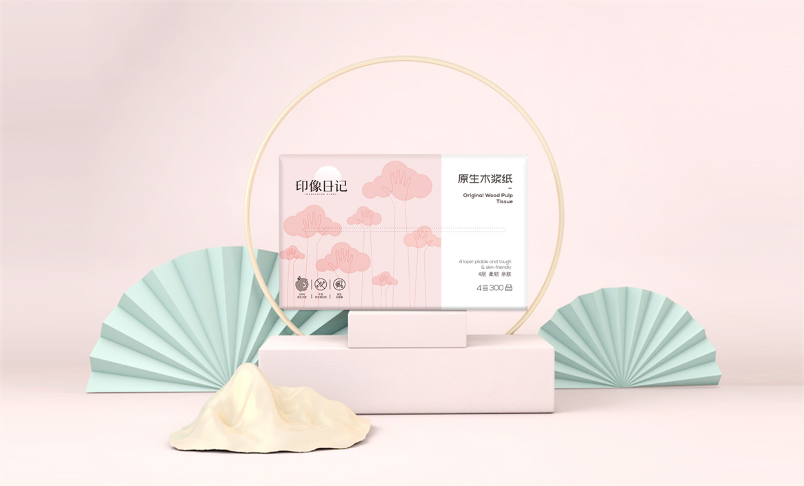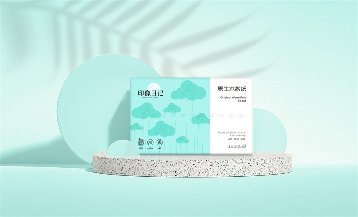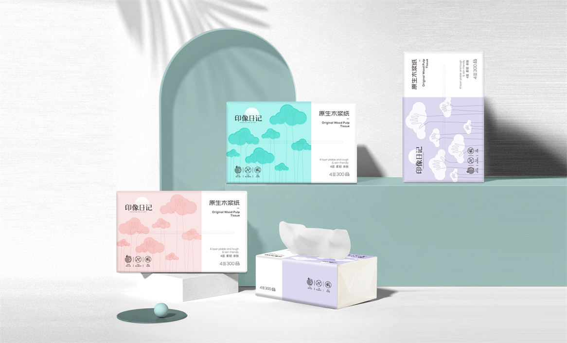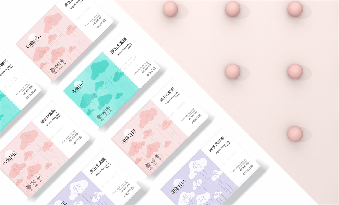 印象日記原生木漿紙包裝設計以“自然手護”為創作理念,用柔和的云朵與手構成大樹森林,風格自然、柔和、舒適,表達印象日記“原生、柔韌、親膚”的產品訴求。